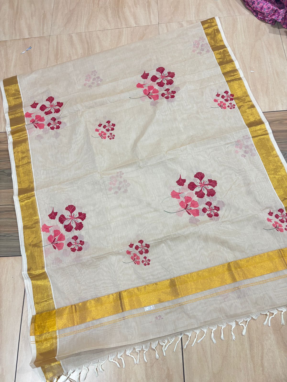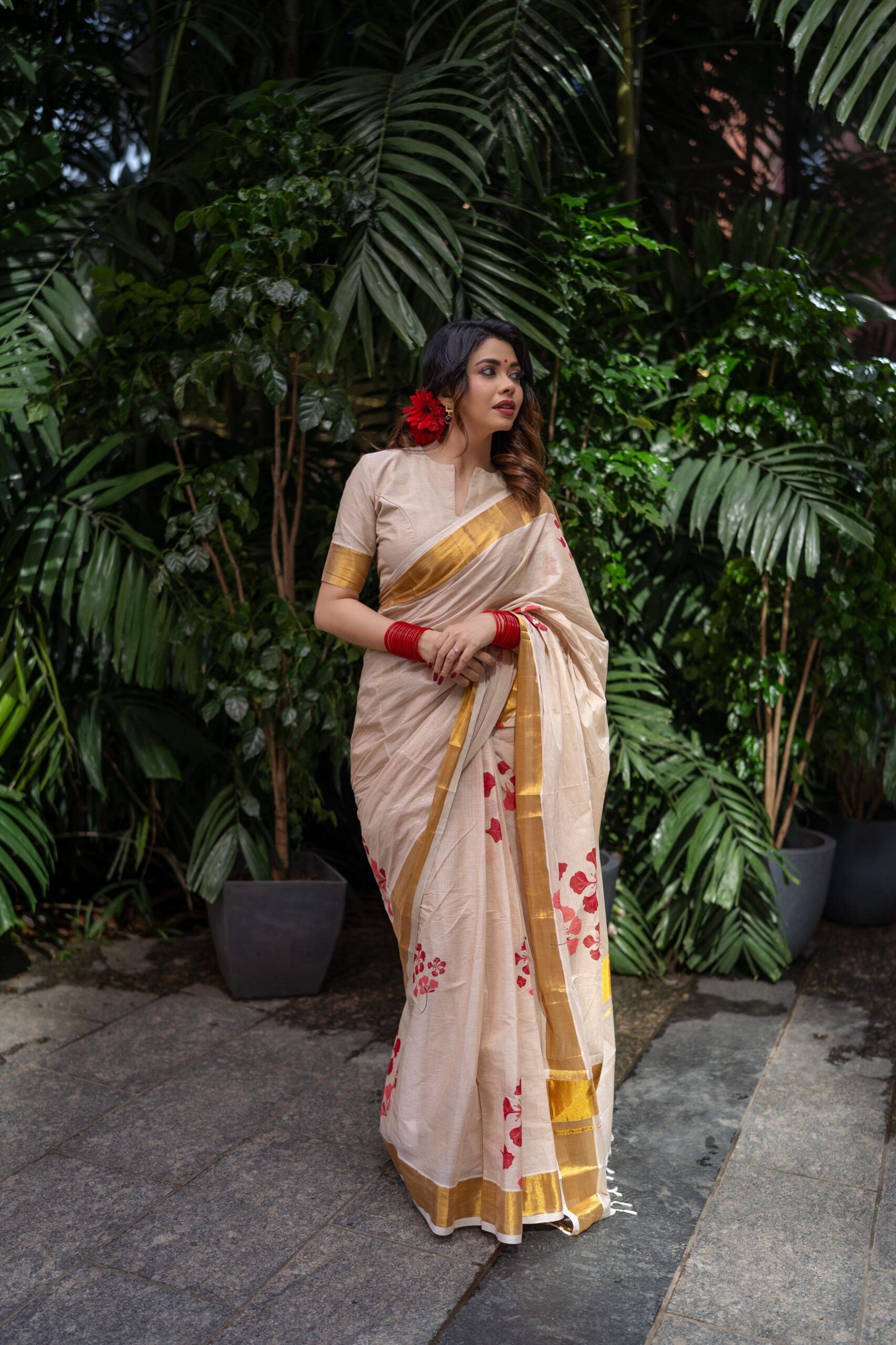 The Shiny Hibiscus Design Premium Saree is a graceful blend of Kerala tradition and contemporary elegance & beautifully highlighted. The coordinated blouse complements the Saree perfectly, creating a refined ethnic look ideal for celebrations, cultural events, temple visits, and special occasions. With its timeless appeal and comfortable drape, reflects understated luxury rooted in tradition.