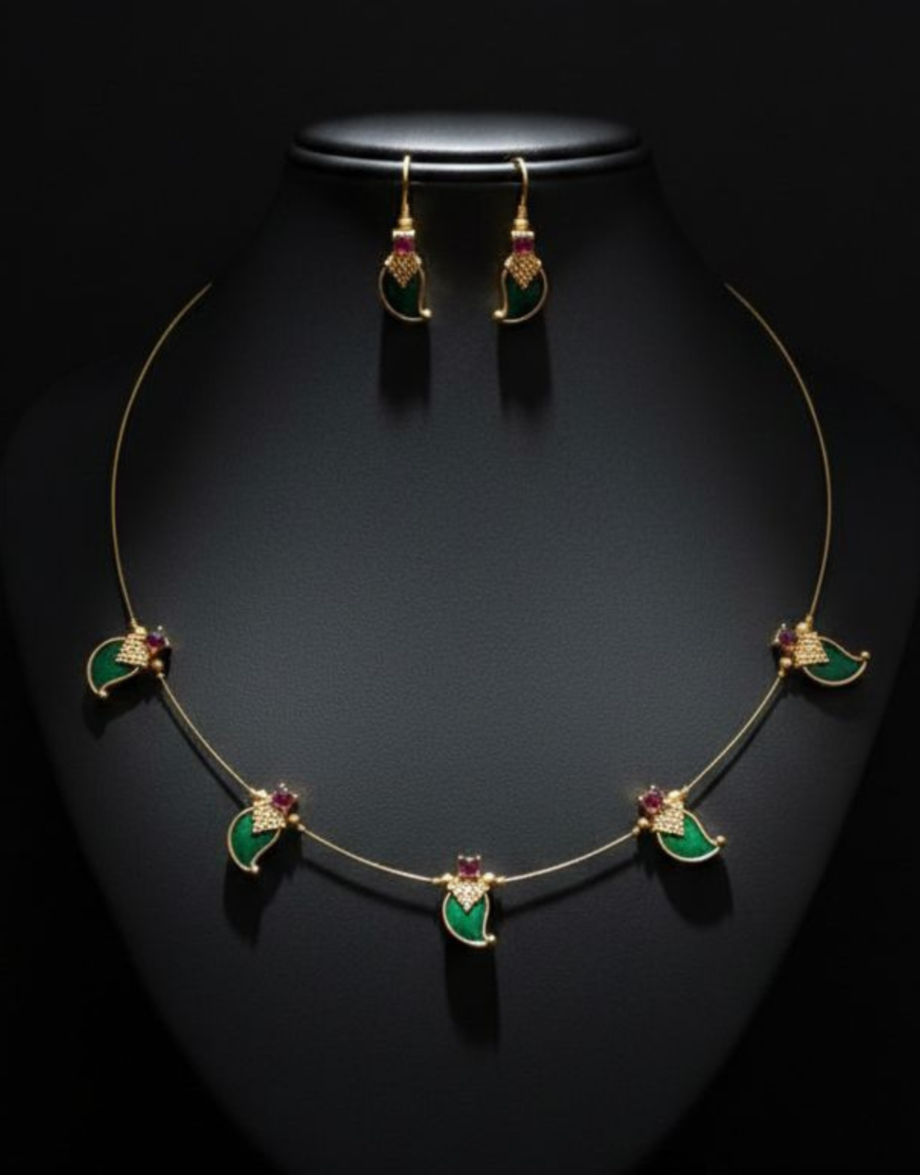 The Unseen Necklace Set is a delicate and modern piece designed for those who love minimal elegance. Featuring a sleek, thin wire-style chain, this necklace is adorned with small green leaf-shaped stones highlighted with tiny ruby accents, creating a soft and graceful look. The matte gold finish adds a subtle royal touch, while the aluminium and copper alloy base makes it lightweight and comfortable for all-day wear. Paired with matching drop earrings, this set is perfect for casual parties, festive gatherings, office wear, and simple traditional outfits.