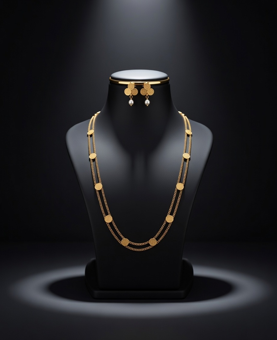 This stunning Coin Long Haram is a timeless piece inspired by traditional temple jewellery. Designed with a graceful double-chain pattern and beautifully embossed Lakshmi coins, this haram radiates classic South Indian elegance. The matte gold finish gives it a rich antique look, while the copper alloy base ensures durability and comfort. Paired with matching coin drop earrings, this set is perfect for weddings, festive occasions, poojas, and traditional functions. A must-have accessory for those who love heritage-style jewellery with a modern touch.