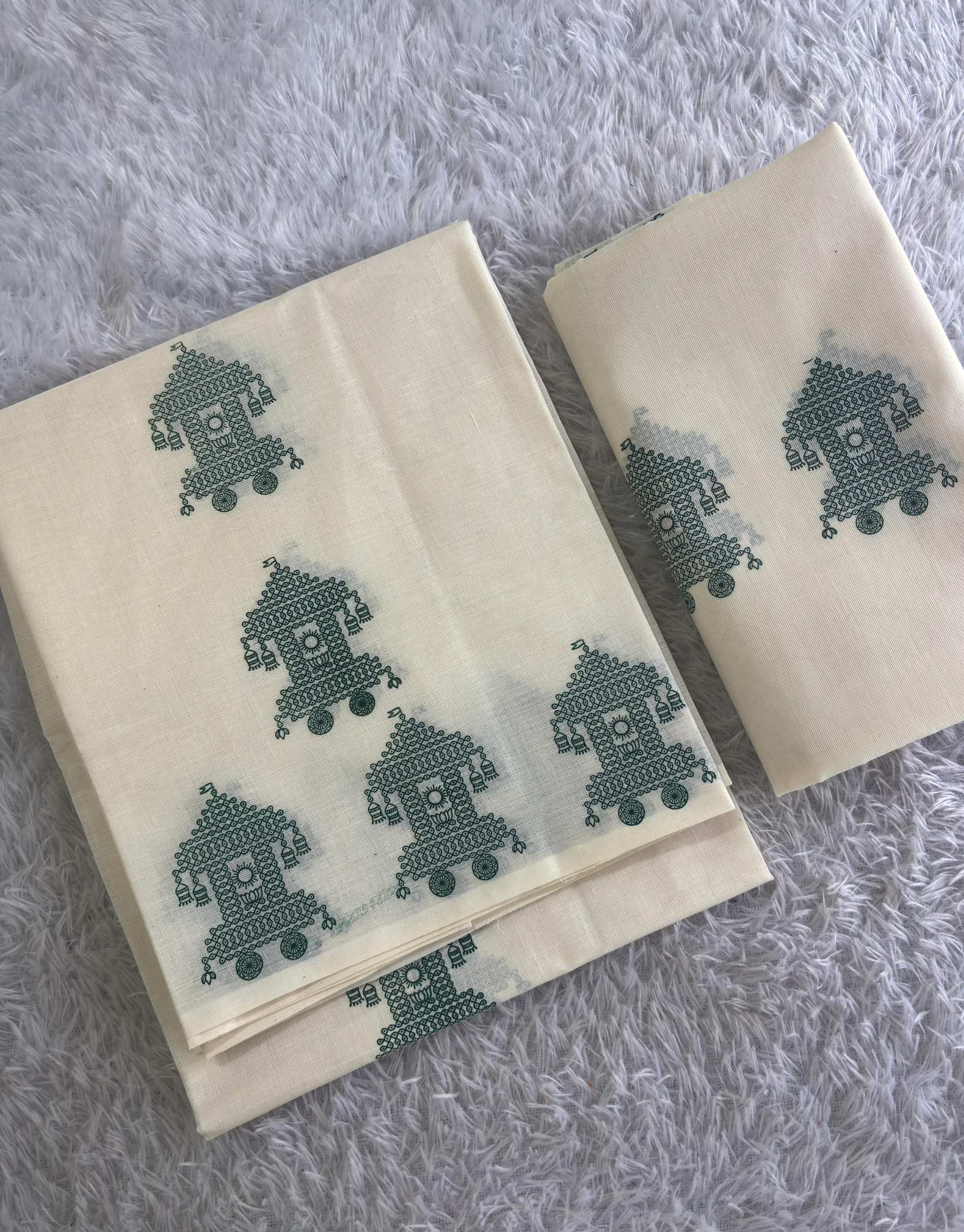 The Chariot Design Set Mundu is a graceful expression of Kerala’s traditional artistry. Crafted in a soft cream base, this elegant set mundu is adorned with intricate ratha (temple chariot) inspired kollam motifs, woven in a subtle earthy tone. The symmetrical placement of the motifs creates a refined and cultural appeal, making it perfect for those who appreciate heritage with a modern touch. Lightweight, breathable, and comfortable, this set mundu is ideal for festive occasions, temple visits, cultural programs, and traditional ceremonies.