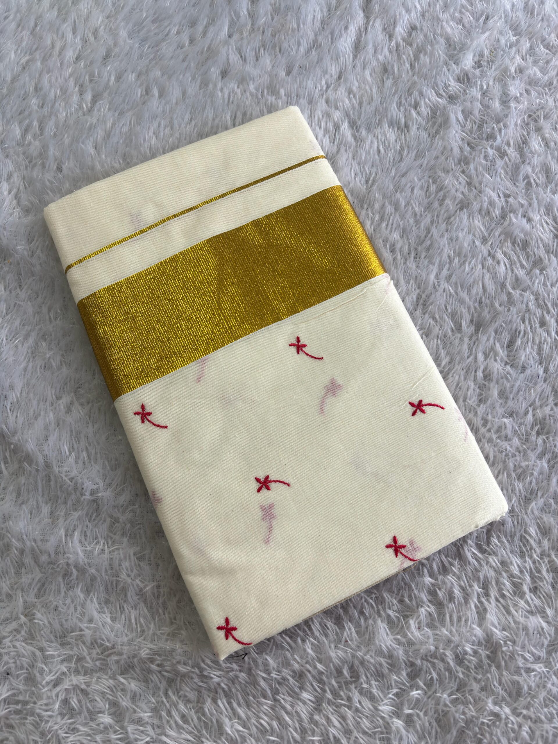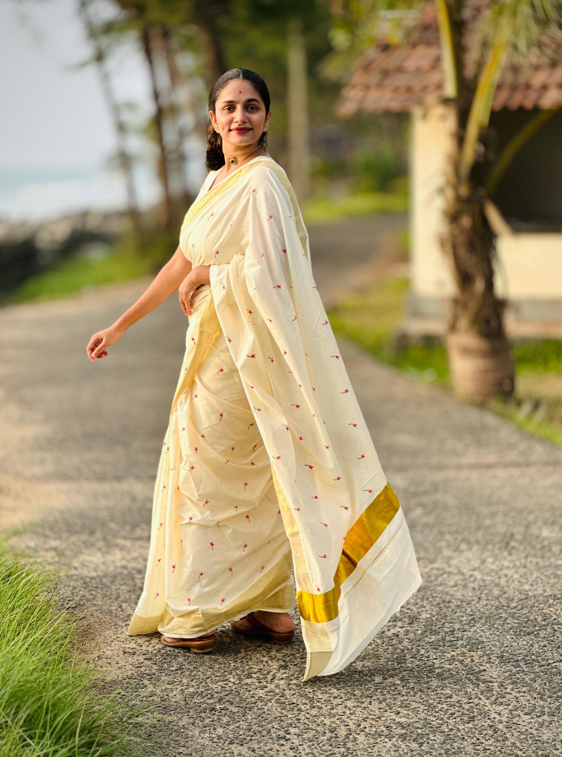 - Design: Features a classic off-white body with Kannikonna Embroidery Saree floral prints.