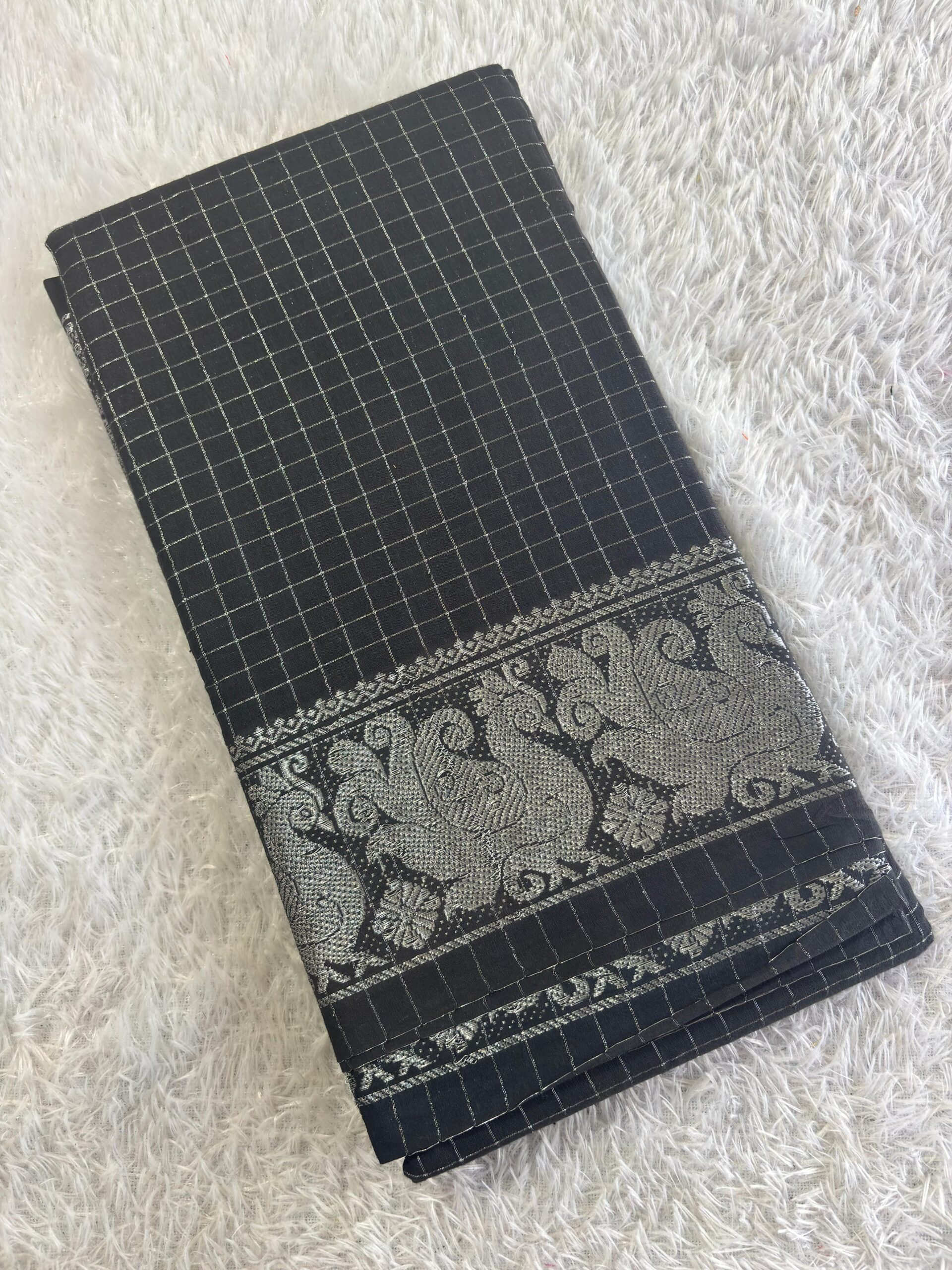 Grace meets tradition in this elegant Silver Contrast Border Saree Crafted from soft, breathable pure cotton, this saree features a refreshing teal body adorned with subtle silver jari motifs that add a gentle shimmer. The rich charcoal-black contrast border and pallu create a striking visual balance, giving the saree a premium and timeless appeal. Lightweight and comfortable, it drapes beautifully, making it perfect for long festive days, office wear, temple visits, and casual functions. This saree blends classic South Indian craftsmanship with modern elegance, making it a must-have for every saree lover.