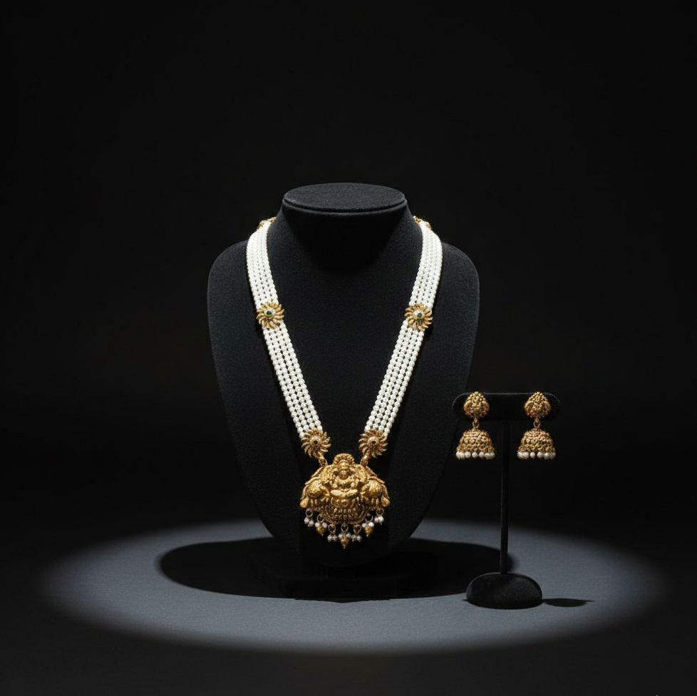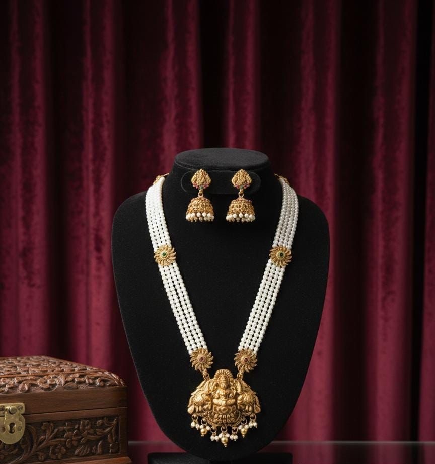 The Tetra Line Peral Haram is a refined three-strand necklace featuring perfectly matched, creamy white pearls that drape gracefully along the neckline. The set is completed by a pair of matching stud earrings that echo the central design, creating a harmonious and polished look. This ensemble beautifully bridges the gap between vintage charm and modern elegance, making it an ideal choice for weddings, cultural celebrations, or high-profile evening events.